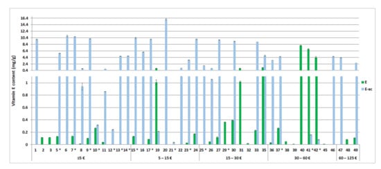 Determined content of tocopherol (E) and tocopheryl acetate (E-ac) in the tested cosmetics (1–49) in mg per g of the cosmetic product (average ± SEM, n = 3) in relation to the product’s price (per 50 mL). In the tested cosmetics numbered 4, 18, 28, 34, 43, and 44, the labelled vitamin E was not detected. In the tested cosmetics marked with *, a labelling error was observed.