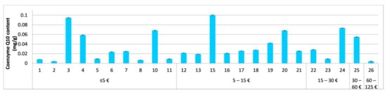 Determined content of coenzyme Q10 in the tested cosmetics (1–27) in mg per g of the cosmetic product (average ± SEM, n = 3) in relation to the product’s price (per 50 mL). In the tested cosmetics numbered 9, 14, and 27, the labelled coenzyme Q10 was not detected.