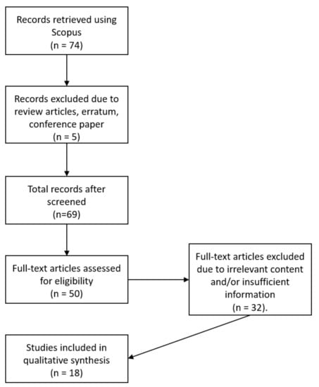 Screening of the records was conducted to select suitable references. In this case, no duplication occurred hence the 74 records were further screened based on several inclusion and exclusion criteria. The first criterion was the article type which focused on primary source research articles. Hence, publications in the form of review, erratum and conference proceedings were excluded and, in this case, a total of five articles were excluded. It is worth mentioning that the systematic review only focused on articles published in English, while there was no limitation placed on the timeline due to the few publications retrieved. Most importantly, articles with full-text access were selected. Articles retrieved from the Scopus search were downloaded as full-texts through search engines such as Lancaster University OneSearch, Google Scholar, Elsevier and ResearchGate. Overall, a total of 50 articles were selected for the eligibility screening process.