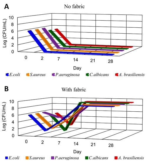 In order to identify the origin of wet wipe contamination, the liquid phase of wet wipes containing 0.45% aqueous preservative mixture, composed of 0.3% sodium benzoate and 0.15% potassium sorbate in the final wet wipe formulation, was examined with challenge tests in the presence and absence of nonwoven fabric. The composition of the liquid formulation was as described in Table 1. Figure 1 displays the susceptibility of E. coli, S. aureus, P. aeruginosa, C. albicans, and A. brasiliensis microorganisms to 0.45% organic acids in the two wet-wipe liquid systems: the wet-wipe liquid without the introduction of the fabric and the wet-wipe liquid that had been in contact with 80/20 PET/viscose nonwoven fabric. The challenge results demonstrated that, when the nonwoven wipes were absent (Figure 1A), the challenge test met the EP test criteria, while in the presence of the 80/20 PET/viscose fabric, it did not (Figure 1B). This suggests that the fabric, and/or interactions that may arise due to its existence, contributes to the contamination of the wet-wipe liquid system.