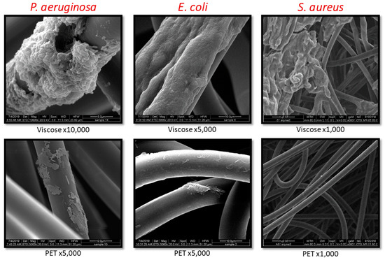 In this study, SEM was used to detect biofilms following three hours’ incubation with 106 CFU/mL of P. aeruginosa, E. coli, and S. aureus microorganisms, separately, on viscose vs. PET fibers (Figure 3). SEM images of the viscose fiber showed large bacterial colonies presenting as biofilms, while the PET fiber surfaces appeared rather “clean”. It is well-known that the extracellular polymers (i.e., biofilms) produced by microbial colonies primarily consist of polysaccharides [13]; therefore, it is reasonable to assume that these polysaccharides could easily adhere to the polysaccharidic cellulosic fabric. As a consequence, biofilms would indeed favorably form on the viscose surface rather than on the PET one, having a limited affinity for the latter. These observations agree with and confirm the outcome of the challenge tests (Figure 2), stressing that the viscose fabric bears the key role in wet wipe contamination.
