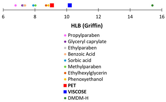 Griffin’s hydrophilic–lipophilic balance (HLB) formula (Formula (1)) was utilized, derived from the non-ionic surfactant field [28,29]. According to Griffin, the HLB of an amphiphilic molecule is the value obtained by dividing the weight fraction of the hydrophilic part by the total weight of the molecule and multiplying by twenty, giving a result on a scale of 0 to 20. An HLB value of 0 corresponds to a highly hydrophobic molecule while a value of 20 corresponds to a highly hydrophilic one. By comparing the HLB values of diverse preservative molecules, as well as those of viscose and PET (under their monomeric forms), we aimed to evaluate the affinity between the preservatives and the fabric constituents.