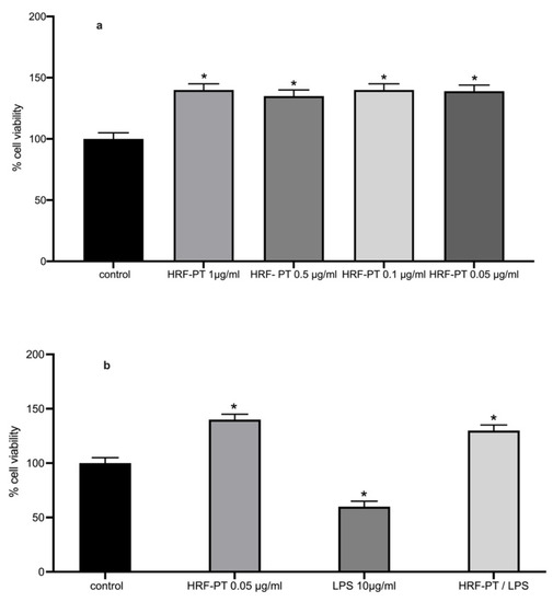 Cell viability (%) assessment based on MTT assay expressed as mean ± SEM for (a) control (untreated NHDF cells), NHDF cells treated with different concentrations of HRF-PT (0.05–1 μg/mL). Cell viability is increased with the addition of HRF-PT in different concentrations (0.05–1 μg/mL) compared to control (p < 0.05); (b) control (untreated NHDF cells), NHDF cells treated with different concentrations of HRF-PT (0.05 μg/mL), NHDF cells under LPS (10 μg/mL) treatment (LPS 10 μg/mL), NHDF cells under LPS treatment with HRF-PT (0.05 μg/mL) (HRF-PT/LPS). Cell viability is increased with the addition of HRF-PT (0.05 μg/mL) under or without LPS treatment (p < 0.05). * p < 0.05 significantly different from the control (ANOVA test).
