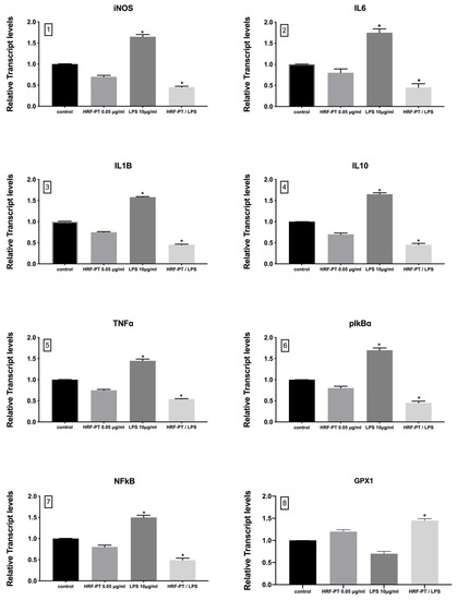 The relative gene expression of iNOS, IL6, IL1B, IL10, TNFα, pikBα, NFkB, GPX1 presented as a fold change ± SEM compared to untreated NHDF cells. The expressions of iNOS (1), IL6 (2), IL1b (3), IL10 (4), TNFα (5), pikBα (6), and NFkB (7) were down-regulated in NHDF cells with the addition of HRF-PT under or without LPS treatment compared to control (p < 0.05). The expression of GPX1 (8), was up-regulated in NHDF cells with the addition of HRF-PT under LPS treatment compared to control (p < 0.05). Experimental conditions: control (untreated NHDF cells), NHDF treated with HRF-PT (0.05 μg/mL), LPS-treated NHDF (10 μg/mL), LPS-treated NHDF (10 μg/mL) with HRF-PT (0.05 μg/mL). * p < 0.05 significantly different from the control (ANOVA test). The data correspond to the mean ± SEM of three independent experiments and six replicates each time.