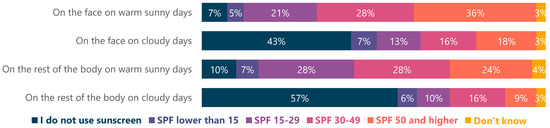 We also asked respondents about the SPF they use (Figure 2). While about 3% of participants did not know what SPF they generally use, on warm and sunny days, people preferred sunscreen with an SPF of 50 or higher for the face. While on cloudy days, the majority of respondents did not use sunscreen, people preferred an SPF of at least 15 for both their face and body in a variety of circumstances.