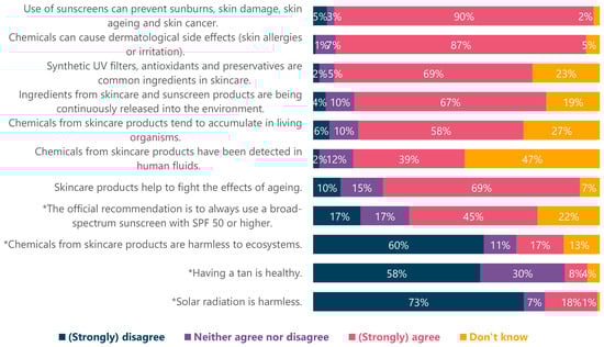 Participants were asked to rate their level of agreement with 11 statements to find out how knowledgeable they were about sunscreen use, ingredients in skincare products, and their relationship to our health and environment. To ensure greater objectivity, the items were distributed across the survey, and four of them (marked with an *) were inverted, meaning they represented a false claim.