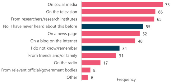 Subjects were also asked if and where they have heard that research has shown that synthetic ingredients are harmful to corals and other marine life (Figure 4). A total of 63.9% said they had known about this information. Most of them learned about it from social media (f = 73), television (f = 66), and researchers or research institutes (f = 65).