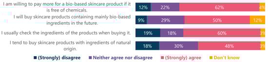 Eleven items were used to measure participants’ attitudes towards bio-based ingredients, five of which represented an inclination towards naturally and sustainably sourced ingredients (Figure 8). Attitude towards bio-based ingredients, in general, was positive (M = 3.64, SD = 0.47). The highest-rated items referred to the importance of ingredient sourcing and sustainable production (M = 4.42, SD = 0.62, Mdn = 4, IQR = 4–5), valorization of agricultural waste as ingredients being innovative (M = 4.06, SD = 0.86, Mdn = 4, IQR = 4–5), and the positive environmental impact of bio-based skincare products (M = 4.04, SD = 0.85, Mdn = 4, IQR = 4–5). In contrast, participants agreed the least with the statement that they prefer conventional ingredients over bio-based ingredients (M = 2.12, SD = 0.88, Mdn = 2, IQR = 2–3), being apprehensive towards skincare of brownish color (M = 2.35, SD = 1.08, Mdn = 2, IQR = 2–3), and the inability of bio-based ingredients to replace synthetic ones (M = 2.38, SD = 1.06, Mdn = 2, IQR = 2–3). Three-fourths of participants are worried about the environmental impact of synthetic ingredients (M = 3.99, SD = 0.89, Mdn = 4, IQR = 4–5) but also perceive that bio-based skincare products are more expensive (M = 4.01, SD = 0.69, Mdn = 4, IQR = 4). In addition, one-fifth of respondents did not know how bio-based ingredients compared to synthetic ones in terms of functionality (M = 2.53, SD = 0.96, Mdn = 3, IQR = 2–3).