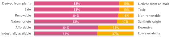 Figure 10 shows the selection of adjectives that participants felt best represented lignin. More than 80% of subjects perceive lignin as being derived from plants, safe, renewable, and of natural origin, and more than 60% believe it is affordable and industrially available.