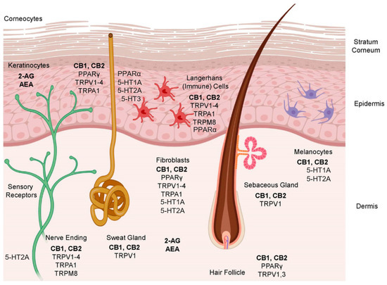 The sum of these factors may result in synergistic or antagonistic biological effects. Therefore, it is important to take them into account to predict the pharmacological or cosmetic activity of a cannabinoid ligand. The biodynamic effect of these secondary cannabinoid targets and their location in the skin are detailed in Table 1 and illustrated in Figure 2.