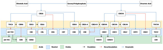 The Biosynthesis of most known cannabinoids [64,65,66], CBGA: cannabigerolic acid; CBGVA: cannabigerovarinic acid; THCA: tetrahydrocannabinolic acid; Δ9-THC: delta-9 tetrahydrocannabinol; Δ8-THC: delta-8 tetrahydrocannabinol; CBNA: cannabinolic acid; CBN: cannabinol; CBND: cannabinodiol; CBCA: cannabichromenic acid; CBC: cannabichromene; CBLA: cannabicyclolic acid; CBL: cannabicyclol; CBG: cannabigerol; CBT: cannabitriol; CBDA: cannabidiolic acid; CBD: cannabidiol; CBEA-A: cannabielsoin acid A; CBEA-B: cannbielsoin acid B; CBE: cannabielsoin; CBDVA: cannabidivarinic acid; CBDV: cannabidivarin; CBDEV: cannabidielsoinvarin; CBNDV: cannabivarinodiol; CBCVA: cannabichromevarinic acid; CBCV: cannabichromevarin; CBLVA: cannabicyclolvarinic acid; CBLV: cannabicyclolvarin; CBTV: cannabitiolvarin; CBGV: cannabigerovarin; THCVA: tetrahydrocannabivarinic acid; THCV: tetrahydrocannabivarin; CBV: cannabivarin.