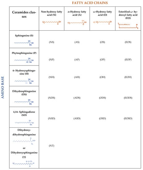 Lipids of the skin consist mainly of ceramides (50%), cholesterol and its esters (37%), cholesterol sulfate (2–5%), and NEFAs (10–15%). SC structure follows the model ‘bricks and mortar’ where the ‘bricks’ are keratin-rich keratinocytes held in place by the lipids which are the ‘mortar’ of the SC [14]. Ceramides (CERs) consist of a hydrophobic fatty acid chain linked to an amino-containing sphingoid base. There are 21 subclasses of CERs with different fatty acid chain length (Figure 1) [15]. Predominant CERs in normal epidermis are the (AH), (AP), (NH), and (NP). Long-chain CERs strongly involved in the maintenance of barrier function while the contribution of short-chain CERs in this function is negligible. CERs are bioactive metabolites implicated in epidermal regeneration and immune responses of the skin [11].