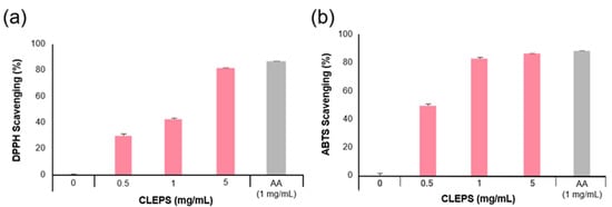 Anti-oxidation efficacy of CLEPS via DPPH (a) and ABTS (b) assays. p > 0.05 vs. 0 mg/mL.