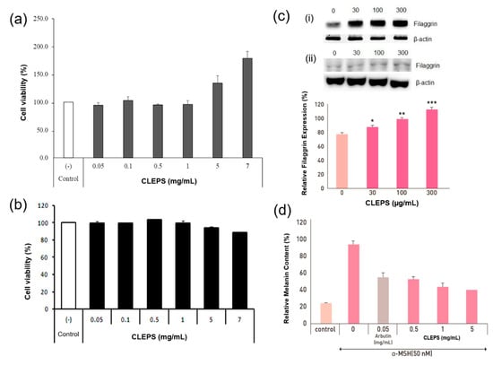 Cell viability and anti-inflammatory tests. Cell viability assays performed with a MTT assay on human dermal fibroblasts (NHDF) (a) and B16 melanoma cells (b). Effects of CLEPS on expression of filaggrin mRNA (i) and proteins (ii) in HaCaT cells (c) (* p < 0.05 ** p < 0.01 *** p < 0.001 vs. untreated). Melanin inhibition in B16 melanoma cells was evaluated by comparing the change in melanin content (%) according to the change in absorbance of the CLEPS untreated group with α-MSH (d) (p > 0.05 vs. control).