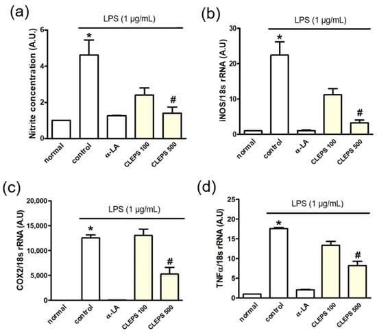 Anti-inflammatory effects of CLEPS (100-500 µg/mL) by inhibiting the inflammatory factors, including NO (a), iNOS (b), COX2 (c), and TNFα (d). * p < 0.05 vs. normal, # p < 0.05 vs. control.