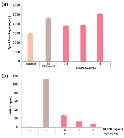 Effect of CLEPS on synthesis of collagen (a) (p > 0.05 vs. control) and inhibition of collagenase (b) (p > 0.05 vs. no PMA).