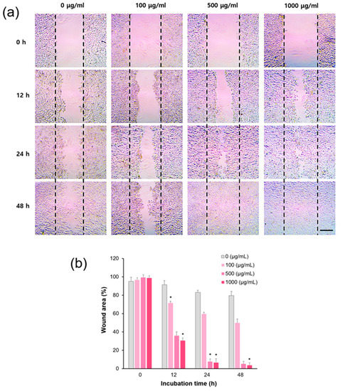 CLEPS-mediated acceleration of wound recovery. A wound healing assay was performed from 0 h to 48 h to analyze the effects of CLEPS (0–1 mg/mL) in HaCaT cells. Scale bar = 100 μm (a). Wound recovery by CLEPS treatment was quantified compared to each zero dose group (* p < 0.05) (b).