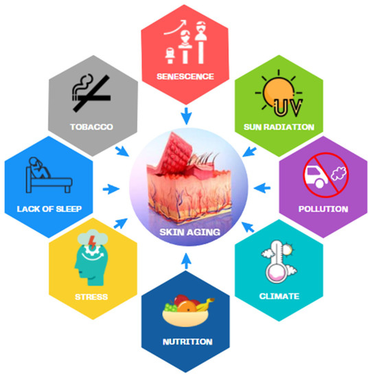 - Farage, M.A.; Miller, K.W.; Elsner, P.; Maibach, H.I. Intrinsic and extrinsic factors in skin ageing: A review. Int. J. Cosmet. Sci. 2008, 30, 87–95. [Google Scholar] [CrossRef] [PubMed]