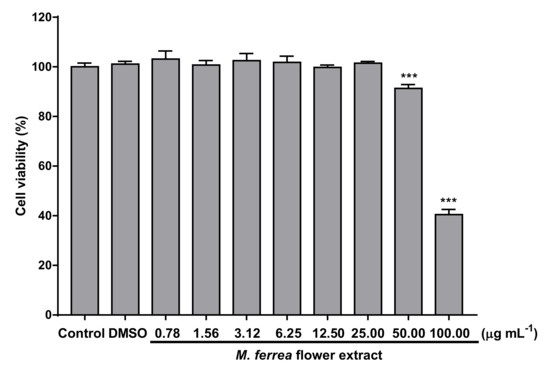 | M. ferrea extract | 227.23 ± 0.01 | 12.87 ± 1.04 | 16.95 ± 1.04 | 96.33 ± 1.05 | 79.83 ± 1.08 |