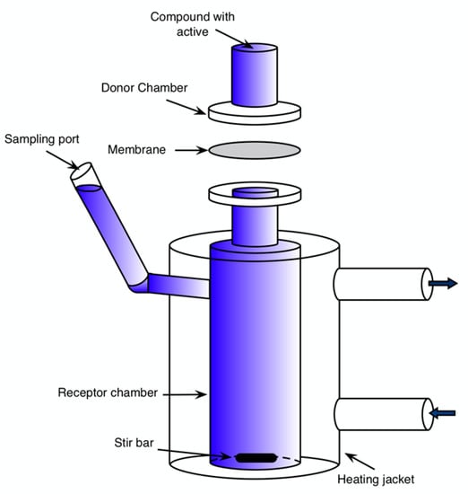 The transdermal passage through kinetic tests of in vitro permeation were performed in Franz cells. Figure 2 shows a Franz cell, which consists of an upper compartment (giver) where the sample under study was placed (vehicle with the active ingredient). Moreover, an inferior compartment (reception) was placed within a liquid, which, in this case, was a saline buffer solution at pH = 7.4, very similar to the mammal’s extracellular liquid [39,78]. A membrane, which in this case was the Strat-M membrane, was placed between both compartments.