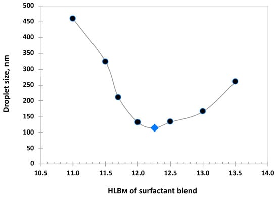 Figure 3. Nanoemulsions droplet size as a function of the HLB of the surfactant blend.