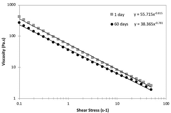 The power law model, written as τ = kγn, was proposed to study the cream rheology characteristics, where: τ is the shear stress expressed in Pascals (Pa); k is the consistency index, i.e., the viscosity at 1 s−1 shear rate, describing how thick (viscous) a material is when low shear is applied to it [74,75]; n is the flow index; and γ is the shear rate at which a shear strain is applied, expressed in reciprocal seconds (s−1). The approximate flow index and consistency index of the cream can be obtained by plotting the natural logarithm of the shear speed and shear stress according to the power law model [74,76].