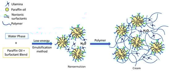 Likewise, the parabens, as preservative agents, were solubilized before adding the Carbopol to the indicated water fraction (20%). Once the pH has been adjusted, this last portion of water was added to the nanoemulsion, and the system was stirred for 2 min at 1200× g to guaratee the homogenization of the final cream.