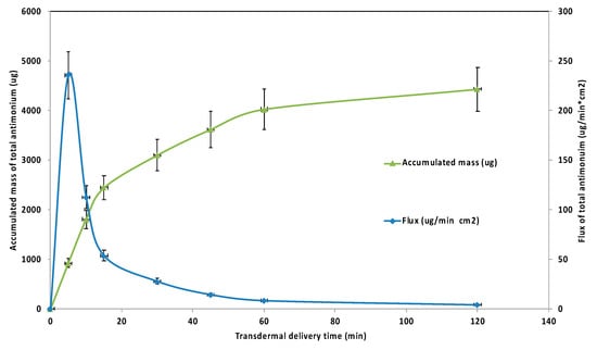 The transdermal passage tests were carried out during 8 h. Samples were taken from the receptor compartment every 15 min, and the antimony content was analyzed. The antimony flux (µg/cm2/min) and the accumulated mass (mg) over time were determined.