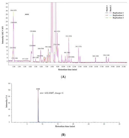 TIC of independent batches and technical replicates revealed consistency and reproducibility. The XIC reproducibility of m/z = 432.10487 at approximately 8.6 was shown in six LC-MS runs. Additionally, this peak exhibited good symmetry and was consistent across the two batches of the experiments (compound coefficient of variance per sample batch as 2%). Additionally, the TIC of all the detected metabolites in the six LC runs revealed that their profiles are extremely comparable in terms of elution time and intensity values, indicating consistency and reproducibility in batches at the overall level.