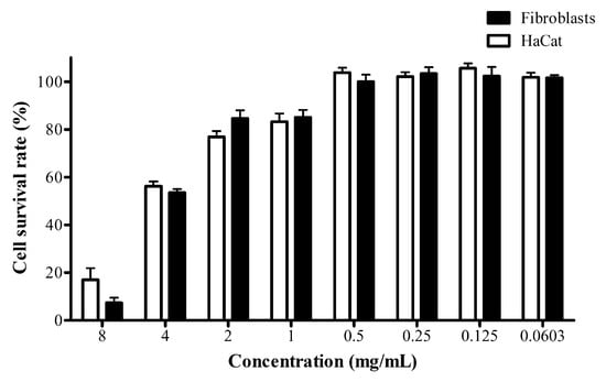 Cell cytotoxicity of the extracts was evaluated using an MTT assay. The dried extracts were freshly dissolved in a culture medium before the experiments. The human fibroblasts and keratinocyte cells were cultured in DMEM containing 10% FBS and 100 IU/mL of penicillin in a humidified environment containing 5% CO2 at 37 °C. Briefly, the cells were seeded at a density of 2 × 104 cells per well in a 96-well plate. The cells were examined for cytotoxicity at various concentrations (8, 4, 2, 1, 0.5, 0.25, 0.125, 0.063 mg/mL) of the extracts and culture medium as control for 24 h. Next, we measured the optical absorbance at 570 nm using the microplate reader and transformed the results into the cell survival rate percentage. The experiments were conducted in triplicate (n = 3).