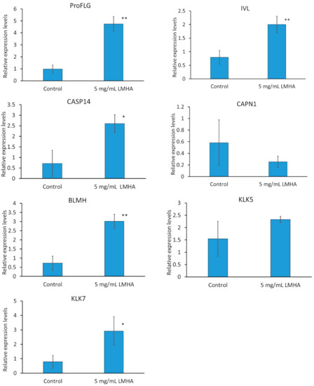Effects of topical application of LMHA on the mRNA levels of proFLG, IVL, CAPN1, CASP14, BLMH, KLK 5, and KLK7 in the 3D epidermis models. n = 3, mean ± standard deviation, * p < 0.05 vs. control. ** p < 0.01 vs. control.