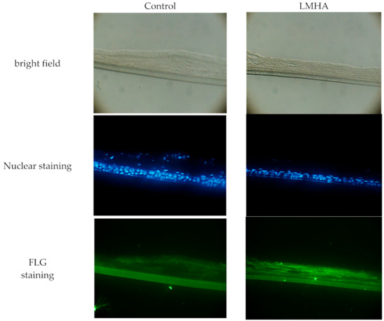 To examine whether the immunoreactivity of FLG was increased in LMHA with higher proFLG mRNA levels, fluorescence antibody against FLG was used. The results are shown below as bright field, nuclear staining, and FLG staining. The fluorescence intensity of immunoreactive FLG (bottom of Figure 3) was greater near the stratum corneum in the 3D epidermis model with topically applied LMHA compared to a model with topically applied solvent (control). In addition, nuclei were observed near the stratum corneum in the control epidermis models.