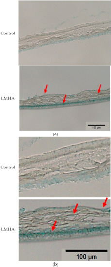 (a) Effects of topical application of LMHA on hyaluronan (Alcian blue staining) in the 3D epidermis model. The red arrows indicate the main areas where hyaluronan staining was observed. (b) Enlarged image of the effect of topical application of LMHA on hyaluronan (Alcian blue staining) in the 3D epidermis model. The red arrows indicate the main areas where hyaluronan staining was observed.