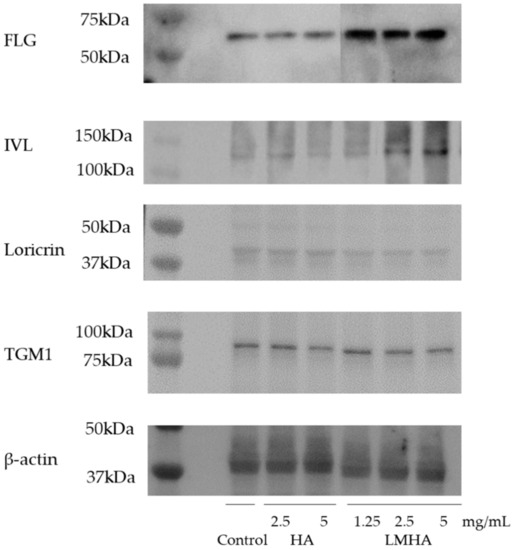 Forty microliters of sterile water (control), 2.5 mg/mL and 5 mg/mL of HA, and 1.25 mg/mL, 2.5 mg/mL, and 5 mg/mL LMHA were added to the 3D epidermis models and incubated at 37 °C for 2 days. After incubation, holes were made in the 3D epidermis models with the Derma Punch, and the membrane and epidermis model were added to an Eppendorf tube. To this, 300 µL of SDS sample buffer was added, mixed by vortexing, and stored in a freezer. Later, the samples were heated at 95 °C for 5 min and centrifuged. Ten microliters of molecular weight marker were used (left lane, no. 1) on an SDS-PAGE gel (two gels were used). On the gels, lane no. 3 was control (solvent), lanes 4 and 5 were topically applied with HA, and lanes 9 to 11 were topically applied with LWHA. Electrophoresis was performed at 54 mA (about 50 V) for 2 h. The membrane was dipped in methanol for 10 s and then immersed in transfer buffer along with filter paper and a pad for at least 15 min. After electrophoresis was completed, the excess gel was cut off and added to the transfer buffer. From the negative electrode core, in the following order, stacks were made of the pads, filter paper, gel, membrane, filter paper, pads, filter paper, gel, membrane, filter paper, and pads. These were fixed in the electrophoresis layer. They were then washed three times for 5 min, and then incubated in a blocking buffer for 1 h. They were then washed three times for 5 min, this time with Tris-buffered saline with 0.05% Tween 20 (TBS-T). Primary antibodies used were as follows: anti-FLG antibody (rabbit) diluted 200×, human anti-IVL mouse antibody (Sigma-Aldrich Corp., St. Louis, MO, USA) diluted 1000×, human anti-loricrin rabbit antibody (Proteintech Group, Inc., Rosemont, IL, USA) diluted 1000×, human anti-transglutaminase 1 (TGM1) rabbit antibody (Proteintech Group, Inc.) diluted 1000×, and human anti-beta-actin mouse antibody (Proteintech Group, Inc.) diluted 10,000× in TBS. After three washes with TBS-T for 5 min, each antibody was diluted 5000 times with the appropriate secondary antibody and washed six times (1 h) with TBS-T. Each antibody was immersed in a 1:1 mixture of A and B of Amersham ECL select Western blotting detection reagent (GE Healthcare, Chicago, IL, USA) and the images were recorded. The photographs were analyzed using ImageJ software.