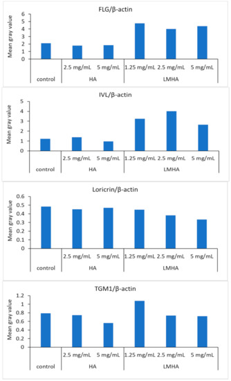 Figure 8 shows Western blotting results for FLG and for the differentiation markers IVL, loricrin, and TGM1, and β-actin from left to right as follows: control; 2.5 mg/mL HA; 5 mg/mL HA; 1.25 mg/mL LMHA; 2.5 mg/mL LMHA; and 5 mg/mL LMHA. Figure 9 shows the results of Western blotting of FLG, IVL, loricrin, and TGM1 proteins by image analysis. FLG protein and IVL protein, a marker of the granular layer, of 1.25 mg/mL, 2.5 mg/mL, and 5 mg/mL concentrations were significantly higher in the LMHA-applied model than in the solvent (control)- or HA-applied model at all concentrations. There was no significant difference in the amount of loricrin protein, which is expressed very late in epidermal differentiation, and TGM1 protein between the models applied with all concentrations of HA or LMHA and those applied with solvent (control).