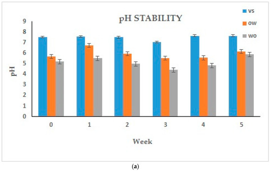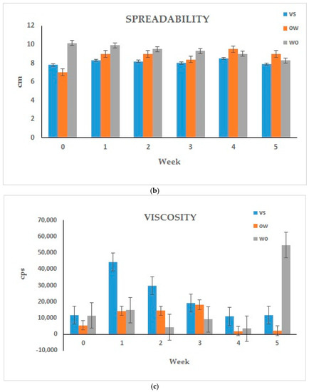 ANOVA analysis showed that the level of significance was >0.05 for the pH, viscosity, and stickiness, which indicates that storage time has no significant effect on pH, viscosity, or stickiness. The statistical results indicate that the resulting cream formula is quite stable in storage for five weeks. Furthermore, the ANOVA analysis on spreadability showed that there was no significant difference between the weekly variants; however, there was a significant difference in the cream variant, hence, the variation between the vs and wo formulas was significantly different.