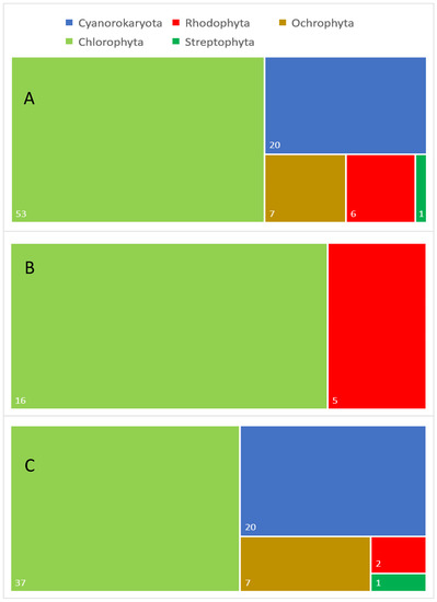 Since the term “algae” has no taxonomic standing, its scope and understanding of AEM in particular, as well as of their ecological groups, are in accordance with the definitions provided in References [2,35]. In this approach, algae from soils, rock, bark and leaf surfaces and building facades are named aeroterrestrial, while algae from caves, ice, snow, permafrost, cryoconites and thermal springs, as well as from unusual acidic habitats, are considered extremophilic. The algal nomenclature follows Algaebase [36], with the synonyms shown at the first appearance of the relevant Latin name.