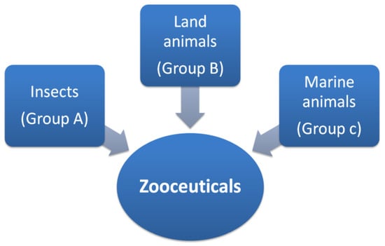 To facilitate the classification of cosmetic ingredients of animal origin, it is possible to group them into categories, as proposed by Proserpio and Passerini [] and reported in Figure 1, i.e., ingredients derived from insects (group A), derived from land animals (group B), and derived from marine animals (group C).