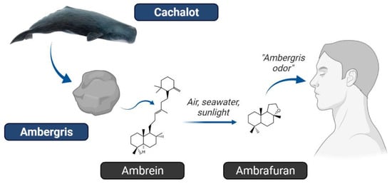 The mechanism of formation of the typical ambergris odor: due to the oxidative decomposition by seawater, air, and/or sunlight, ambrafuran is generated from the ambrein (created with BioRender.com (accessed on 10 December 2021); reworked by []).