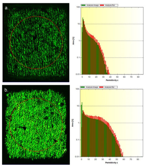 It has been previously reported that the EpsilonTM E100 can assess the changes to skin dryness as a result of usage of a topical moisturizer [20,21]. However, in the previously reported work, a simple average score for the electrical permittivity of the skin was used for the analysis. The value of using 2D hydration assessment, compared with the more traditional ‘single number’ approach to assessing skin hydration, comes from its ability to capture a high-resolution map of the skin in contact with the measurement sensor, with each pixel of the image containing data on the electrical properties in that small area. Example images from the EpsilonTM for normal and dry skin are shown in Figure 1a,b.