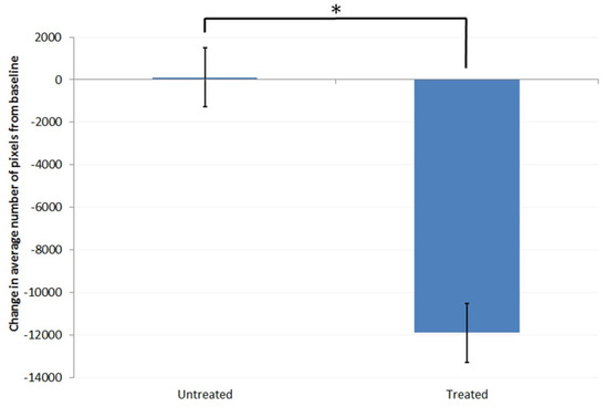 Difference from baseline in the number of pixels in the permittivity range of 0 to 3 (very low permittivity, air gaps) for the treated and untreated sites. Asterisk (*) indicates significant difference between the treated and untreated sites (p < 0.05, compared using ANOVA).