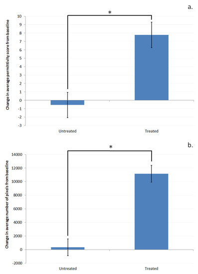 Difference from baseline in (a). average permittivity and (b). the number of pixels, in the permittivity range of 3 to 85 (pixels in contact with the sensor) for the treated and untreated sites. Asterisks (*) indicate significant difference between the treated and untreated sites (p < 0.05, compared using ANOVA).