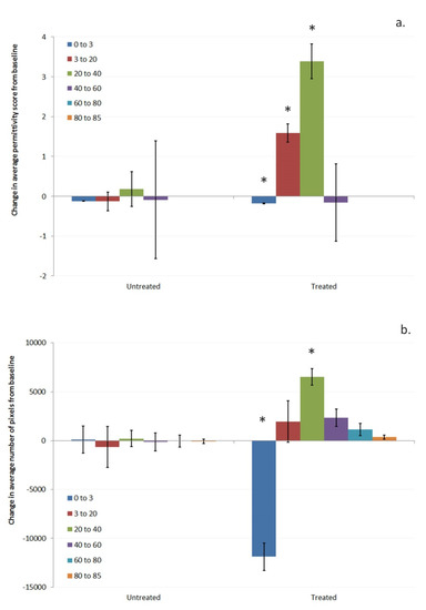 Difference from baseline in (a). average permittivity and (b). the number of pixels, in the permittivity ranges of 0–3, 3–20, 20–40, 40–60, 60–80, and 80–85 for the treated and untreated sites. Asterisks (*) indicate significant difference between the baseline and week 1 data for the treated and untreated sites (p < 0.05, compared using ANOVA).