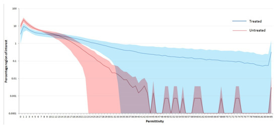 It should be noted here that the data in Figure 5 have not been subtracted from the baseline and are presented as the average percentage of the image for each permittivity unit for the treated and untreated site across all the subjects. No statistical analysis has been carried out on the data in Figure 5 to determine differences between the treated and untreated areas, but it demonstrates the differences between the treated and untreated sites, and the shift towards regions of higher permittivity after product usage. It should also be noted that the y-axis is shown as a logarithmic scale to aid comparison between the treated and untreated sites. Even on the treated site, the majority of the skin has relatively low permittivity scores, and use of a logarithmic scale enables the differences to be more readily observed. It also highlights that there appear to be relatively subtle changes in the electrical properties of skin when it changes from dry to hydrated skin.