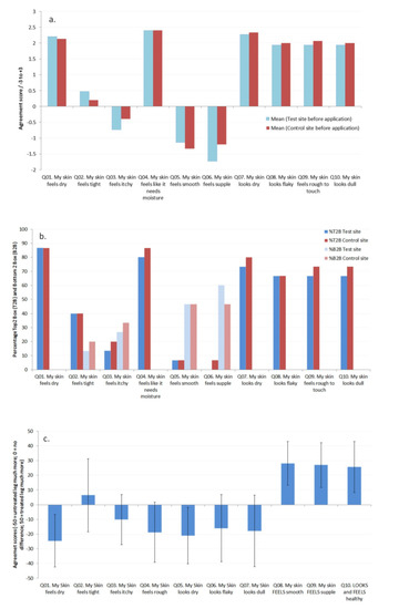 Subject evaluation of their skin (a). average response on the Test and Control sites before product application began (−3 ‘very much disagree’ to +3 ‘very much agree’), (b). Top 2 box (T2B; +3 and +2) and Bottom 2 box (B2B; −3 and −2) analysis of the responses before product evaluation for the Test and Control sites, and (c). comparison of the Test (treated) and Control (untreated) legs after 1 week of product usage (−50 = untreated leg much more; 0 = no difference; 50 = treated leg much more).