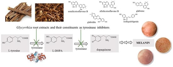Although different mechanisms are involved in the melanogenesis process, key enzymes responsible for melanin biosynthesis are the polyphenolic oxidase tyrosinases. Melanogenesis is the physiological process of melanin formation in which tyrosinase, a copper-dependent enzyme, initiates the first step []. In detail, melanogenesis is directly regulated by three enzymes: tyrosinase, tyrosinase-related protein TRP-1, and TRP-2. Tyrosinase catalyzes the conversion of L-tyrosine to L-DOPA and then to dopachrome, which is subsequently polymerized spontaneously to melanin via a series of reactions []; consequently, tyrosinase is responsible for skin hyperpigmentation. In the last few years, this enzyme became an essential target for skin-whitening effects and therapeutic interventions associated with melanin hyperpigmentation []. Thus, molecules acting as tyrosinase inhibitors play an important role in cosmetic products as skin-whitening agents and in the treatment of various dermatological disorders. Flavonoids are the most representative class among natural phenolic compounds acting as tyrosinase inhibitors []. Numerous plants, among which are Glycyrrhiza spp. and natural compounds, have been reported for tyrosinase inhibitory activity, and they are used in the treatment of skin pigmentation [] (Figure 3). Among Glycyrrhiza spp., the most investigated species is represented by G. glabra. The extract of G. glabra roots is reported for its strong anti-melanogenic activity, tested by reduction of intracellular tyrosinase and melanin content in B16F10 melanoma cells. Methanol and ethyl-acetate extracts of licorice roots exhibited significant activity with low IC50 values (2.1 and 4.7 µg/mL) []. Glycyrrhiza glabra extract was also compared to kojic acid, a molecule currently used as a tyrosinase inhibitor, commercially available. The extract inhibited tyrosinase activity by 78.45% while kojic acid inhibited it by 99.67%. Unfortunately, kojic acid has the disadvantage of being unstable during storage; G. glabra did not show any disadvantages during tyrosinase inhibition, suggesting a possible use of licorice extract in cosmetic formulations []. Along with the effects shown by the licorice extracts, secondary metabolites isolated from G. glabra leaves and roots showed anti-melanogenesis activity. Flavonoids occurring in Glycyrrhiza are reported for their anti-tyrosinase activity.