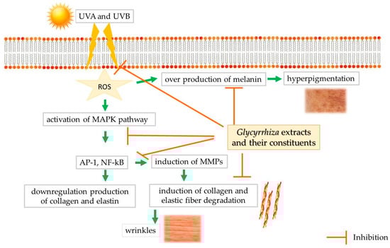 Photoaging is the macroscopic and microscopic modification caused by persistent sun exposure. Most effectors involved in skin photoaging are pro-inflammatory cytokines, ROS, and effector molecules like MMP-1. Their generation is controlled by NF-kappa B, produced due to UV exposition (Figure 4) [].