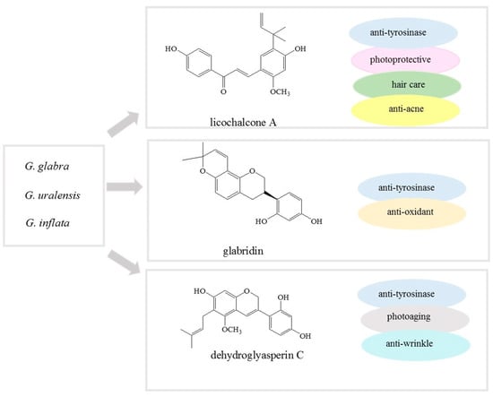 In an overview of the plants used for skin diseases, the anti-acne effects of G. glabra were reviewed additionally to the activity of the plant extracts on atopic dermatitis [].