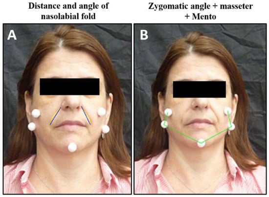 Representative figure showing the distance and angle of nasolabial fold (A) and angle between masseter and mento by the union of the zygomatic, masseter, and mento points (B) used for facial contour analysis and internal facial expression.