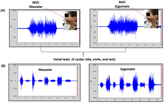 Three MVCs were requested for each phase of movement, biting (action of the masseter muscle) and smiling (zygomatic muscle) with mouth closed [36], while the electrical signals of the masseter and zygomatic muscles were computed (Figure 2A). The maximum muscle activation peak (RMSMAX) was retained for analysis in the normalization procedure. After MVC and 5 min of rest, all participants underwent 4 cycles of a functional task of bite–relax–smile–relax (2 s each stage), in submaximal contraction [33], to remove RMS amplitude during execution (Figure 2B). The average of 4 cycles was used to determine the RMSTASK: Then, the EMG RMS was normalized for each muscle, based on MVC (RMSMAX) to determine the % of muscle activity (tonus) necessary for the implementation of the experimental task, as in the equation below:
